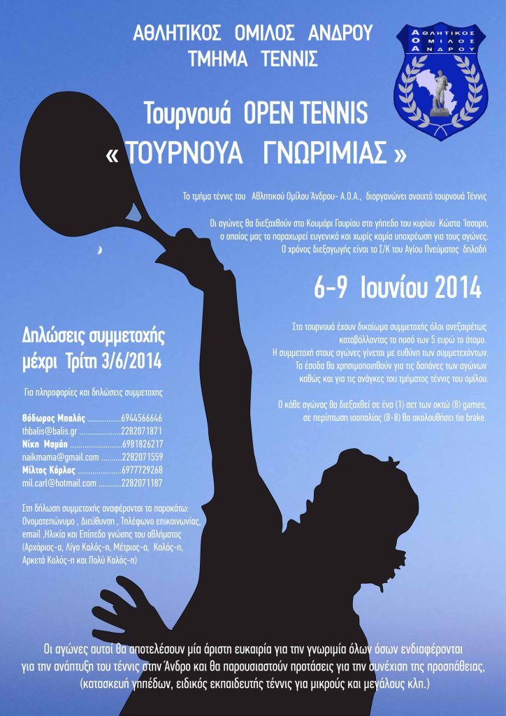 Ο Αθλητικός Όμιλος Άνδρου διοργανωνει αγώνες τέννις στο Κουμάρι Γαυρίου στο γήπεδο του κ. Κώστα Ίσαρη. Ο χρόνος διεξαγωγής τους είναι το τριήμερο του Αγίου Πνεύματος. Δηλώσεις συμμετοχής στα τηλέφωνα Θ. Μπαλής 6944566646 – Νίκη Μαμάη 6981826217 – Μίλτος Κάρλος 6977729268. Μέχρι 3/6 οι δηλώσεις σας.
