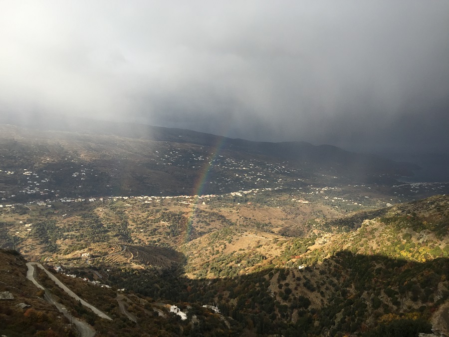 Ένα βαρύ σύννεφό γεμάτο βροχή απλώνει. Η κοιλάδα της Μεσαριάς-Χώρας σκοτεινιάζει. Η βροχή ερχεται. Το Υψηλού και τα Λάμυρα μόλις φαίνονται ανάμεσα από το σύννεφο. Και μόνο ένα ξέφωτο πάνω από τον Νειμποριό και τις γύρω πλαγιές μένει ανοιχτό και το φωτίζει ο ήλιος. Πέρα μακριά το Αιγαίο μοιάζει ορθάνοιχτο. (Φωτ. Χαρίδιμος).