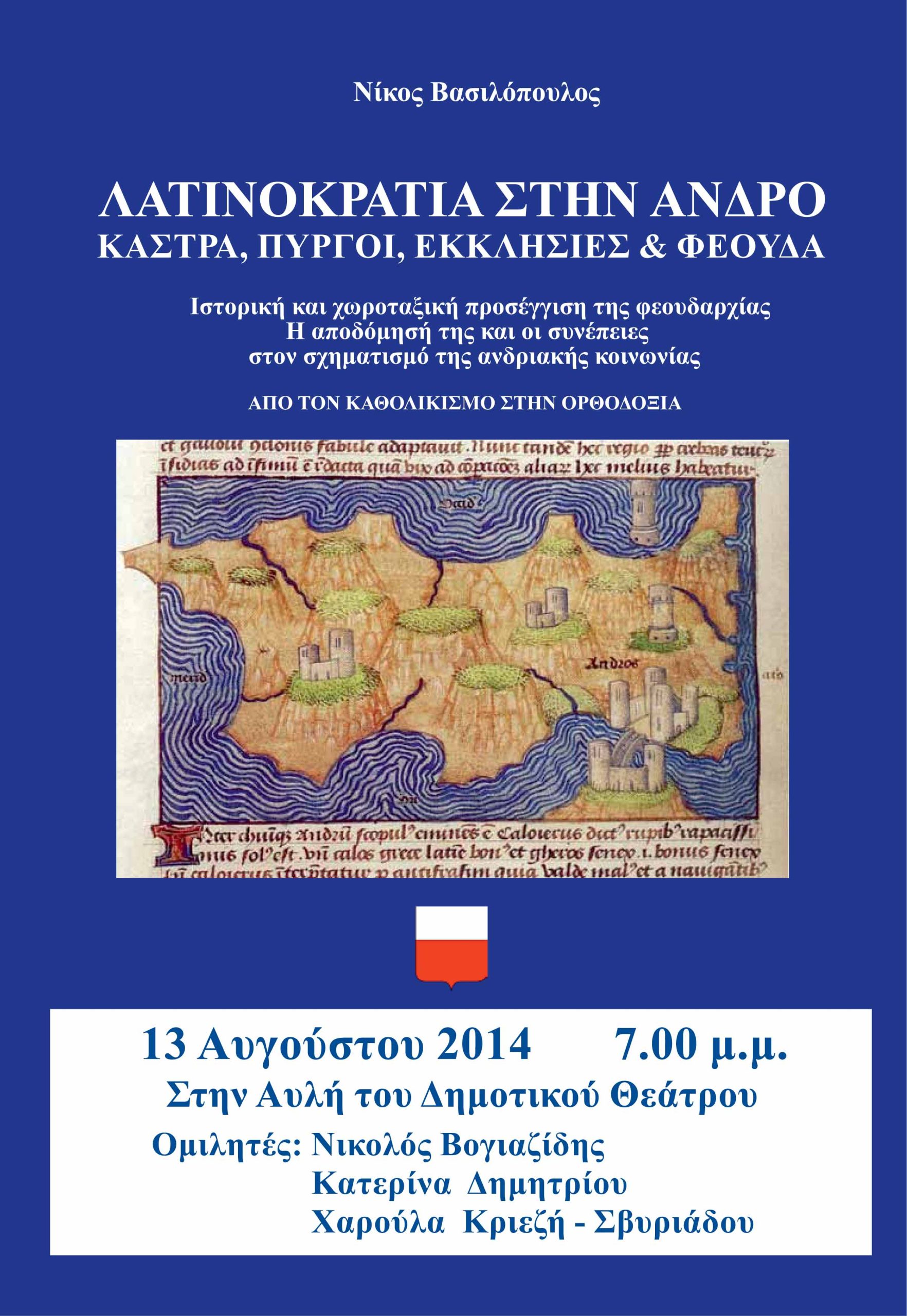 Την Τετάρτη 13 Αυγούστου και ώρα 7.00 στην αυλή του Δημοτικού Θεάτρου στη Χώρα θα παρουσιαστεί το βιβλίο του Νίκου Βασιλόπουλου: Λατινοκρατία στην Άνδρο – Κάστρα, Πύργοι, Εκκλησίες & Φέουδα. Θα μιλήσουν οι: Νικολός Βογιαζίδης, Κατερίνα Δημητρίου, Χαρούλα Κριεζή-Σβυριάδου.