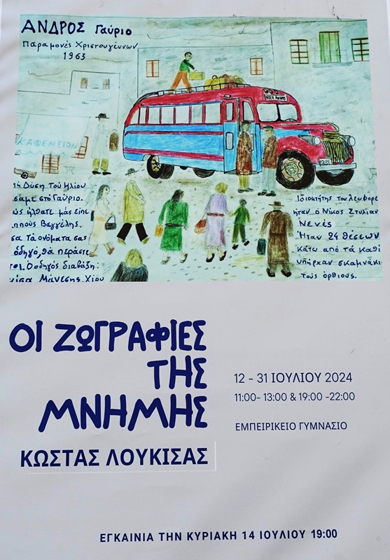 Η αφίσα της έκθεσης προκαλούσε την προσοχή. Μια παιδική ζωγραφιά, ένα λεωφορείο του 1963. Το θυμάμαι αμυδρά. Μικρούλης. 8χρονος ή 9χρονος. Είχα έρθει για καλοκαίρι στην Άνδρο με την μεγάλη μου ξαδέλφη την Κατίνα. Με ένα τέτοιο λεωφορείο πήγαμε καλοκαίρι μέσα της δεκαετίας του 1960 στην Χώρα. Θυμάμαι ακόμα πως κατεβήκαμε, ένα τσούρμο παιδιά διψασμένα… Continue reading ΚΩΣΤΑΣ ΛΟΥΚΙΣΑΣ: Η αβάστακτη τρυφερότητα της παιδικής ηλικίας…