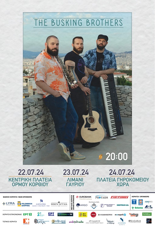 Busking Brothers – Tour on Andros Το 10° Διεθνές Φεστιβάλ Άνδρου 2024, γιορτάζοντας τα δέκα χρόνια λειτουργίας του διοργανώνει μουσικές παραστάσεις στο δρόμο (busking) και φιλοδοξεί να χαρίσει σε όσους τις παρακολουθήσουν μια εμπειρία γεμάτη μουσική, χαρά και ανεμελιά.