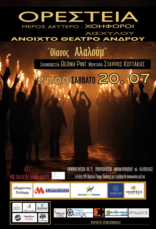 ΑΙΣΧΥΛΟΥ ΟΡΕΣΤΕΙΑ ΜΕΡΟΣ Β’: ΧΟΗΦΟΡΟΙ Ανοιχτό Θέατρο Άνδρου, Σάββατο 20/07, 9μμ. Από τον Ερασιτεχνικό Θίασο Άνδρου «Αλαλούμ» – Υπό την Αιγίδα του Δήμου Άνδρου
