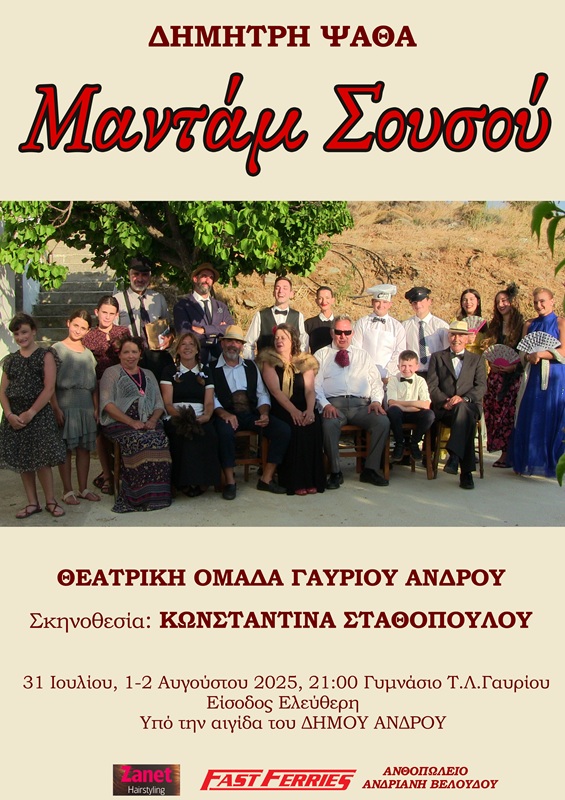 ΔΕΛΤΙΟ ΤΥΠΟΥ Η ΘΕΑΤΡΙΚΗ ΟΜΑΔΑ ΓΑΥΡΙΟΥ ΑΝΔΡΟΥ ΠΑΡΟΥΣΙΑΖΕΙ ΤΗ «ΜΑΝΤΑΜ ΣΟΥΣΟΥ» ΤΟΥ ΔΗΜΗΤΡΗ ΨΑΘΑ ΣΤΙΣ 31 ΙΟΥΛΙΟΥ 1-2 ΑΥΓΟΥΣΤΟΥ ΣΤΟ ΓΑΥΡΙΟ ΜΕ ΕΛΕΥΘΕΡΗ ΕΙΣΟΔΟ