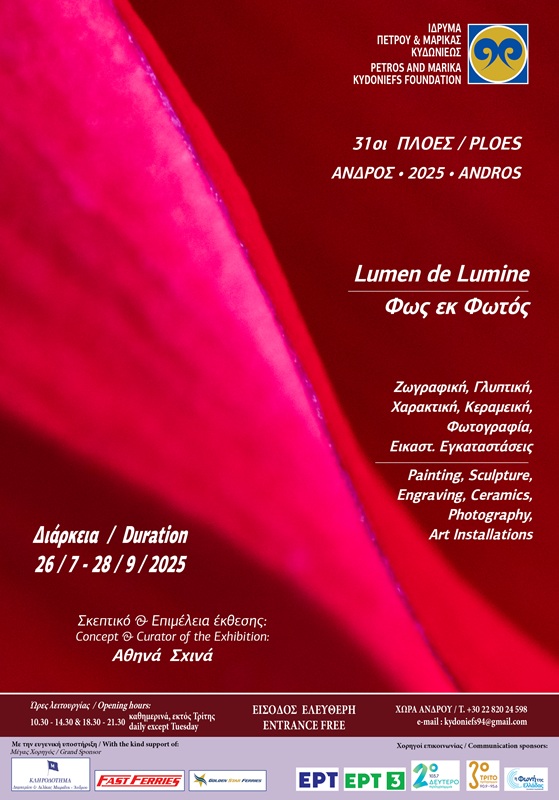 “Φως εκ φωτός”…Στα 31 χρόνια εκθέσεων του Ιδρύματος Κυδωνιέως 31 εικαστικοί καλλιτέχνες παρουσιάζουν δημιουργίες τους στη ζωγραφική, στη γλυπτική, στην χαρακτική, στα κεραμικά, στη φωτογραφία και στις παραστατικές τέχνες. Τα εγκαίνια θα γίνουν το Σάββατο 26/7 στις 20:00 στο κτίριο του Ιδρύματος Κυδωνιέως.