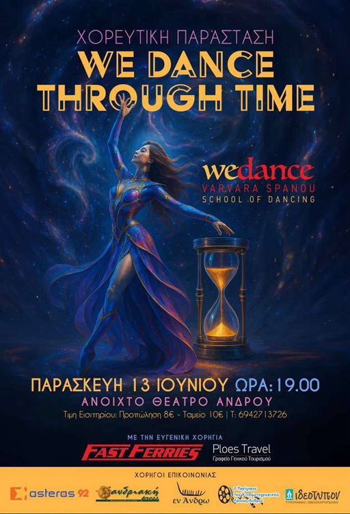ΔΕΛΤΙΟ ΤΥΠΟΥ Σας ενημερώνουμε ότι την Παρασκευή 13 Ιουνίου 2025 και ώρα 19:00 στο Ανοιχτό Θέατρο Άνδρου θα διεξαχθεί η χορευτική παράσταση της σχολής χορού WE DANCE – VARVARA SPANOU καθώς και χορευτικά SHOW από επαγγελματίες χορευτές!