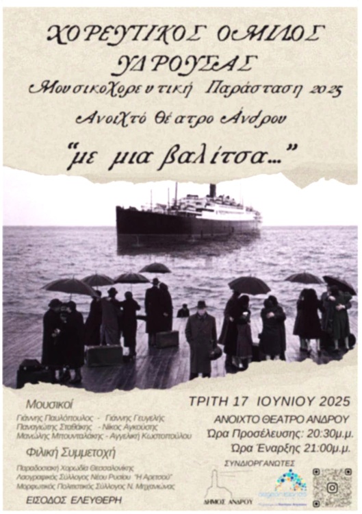 Ο Χορευτικός Όμιλος Υδρούσας έχει τη χαρά και την τιμή να σας προσκαλέσει στη φετινή του καλοκαιρινή μουσικοχορευτική παράσταση, με τίτλο «Με μια βαλίτσα», η οποία θα πραγματοποιηθεί τη Τρίτη 17 Ιουνίου 2025, στις 20:30μ.μ., στο Ανοιχτό Θέατρο Άνδρου. Η παράσταση αποτελεί έναν καλλιτεχνικό στοχασμό πάνω στο φαινόμενο της ξενιτιάς, του ξεριζωμού και της… Continue reading “ΜΕ ΜΙΑ ΒΑΛΙΤΣΑ” : Μια μεγάλη μουσικοχορευτική παράσταση του Χορευτικού Ομίλου Υδρούσας στο Ανοιχτό Θέατρο Άνδρου…