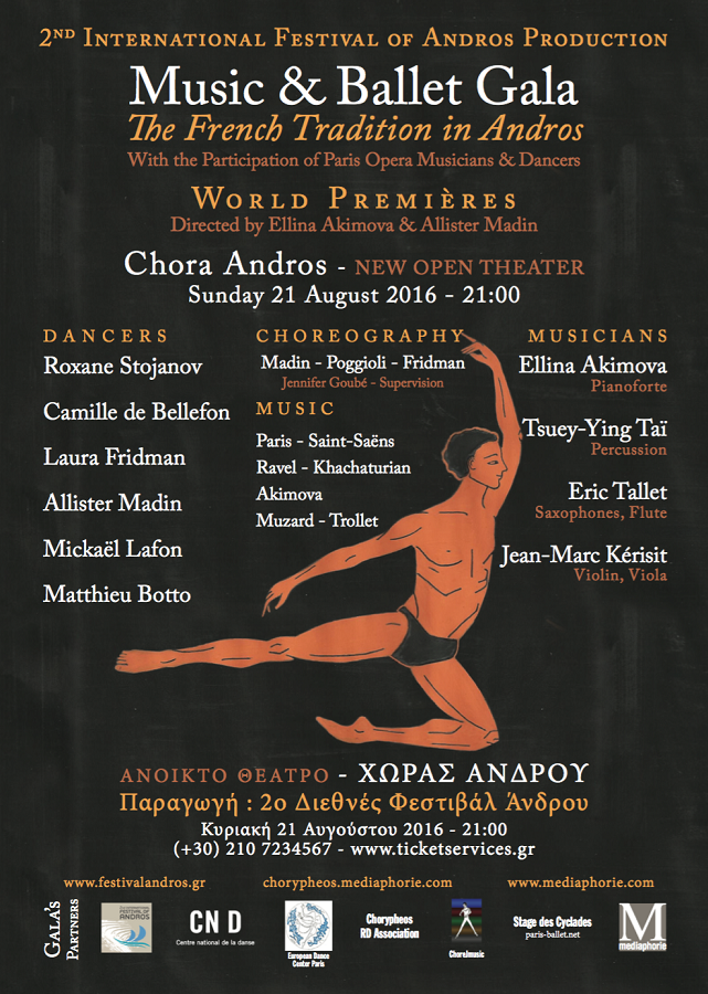 Η αφίσα της διεθνούς συμμετοχής των μουσικών και των χορευτών της Όπερας του Παρισιού στην Άνδρο. Την Κυριακή το βράδυ 21 Αυγούστου το Φεστιβάλ Άνδρου παρουσιάζει στο ανοιχτό θέατρο της Χώρας την μεγάλη γαλλική παράδοση στον χορό στην Άνδρο. Συμμετέχουν 4 μουσικοί και 6 χορευτές της Όπερας του Παρισιού με χορογραφίες σε μουσική Σαιντ Σαντς,… Continue reading Φεστιβάλ: Τα γαλλικά μπαλέτα στην Άνδρο (Κυριακή, 21/8)