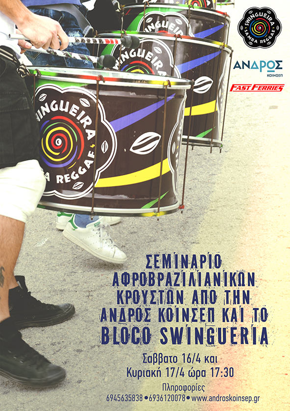 Η Άνδρος ΚοινΣΕπ και το Bloco Swingueria φέρνουν τη Bahia της Βραζιλίας στην Άνδρο!!! Με αφορμή το Κορθιανό καρναβάλι και την παρουσία του Bloco Swingueira σε αυτό, παρατηρήσαμε την ανάγκη όλων για χαρά στη ζωή μας και επαφή με το βαθύτερο εαυτό μας. Κάτι που τα κρουστά-τύμπανα επιτυγχάνουν με το να μας φέρνουν πιο κοντά. Με μεγάλη χαρά… Continue reading ΚΟΙΝΣΕΠ: Μουσική της Βραζιλίας στην Άνδρο!!!