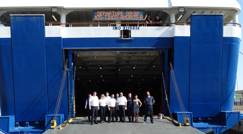 Μέλη του πληρώματος του SuperFerry στον καταπέλτη του πλοίου πριν την αναχώρηση από Ηράκλειο ποζάρουν στον φακό (φωτ. Εν Άνδρω). Η Golden Star Ferries μελετά την διατήρηση της γραμμής Ραφήνα-Ηράκλειο με ενδιάμεσους σταθμούς Άνδρο, Τήνο, Μύκονο, Πάρο και Σαντορίνη και κατά την διάρκεια του χειμώνα!