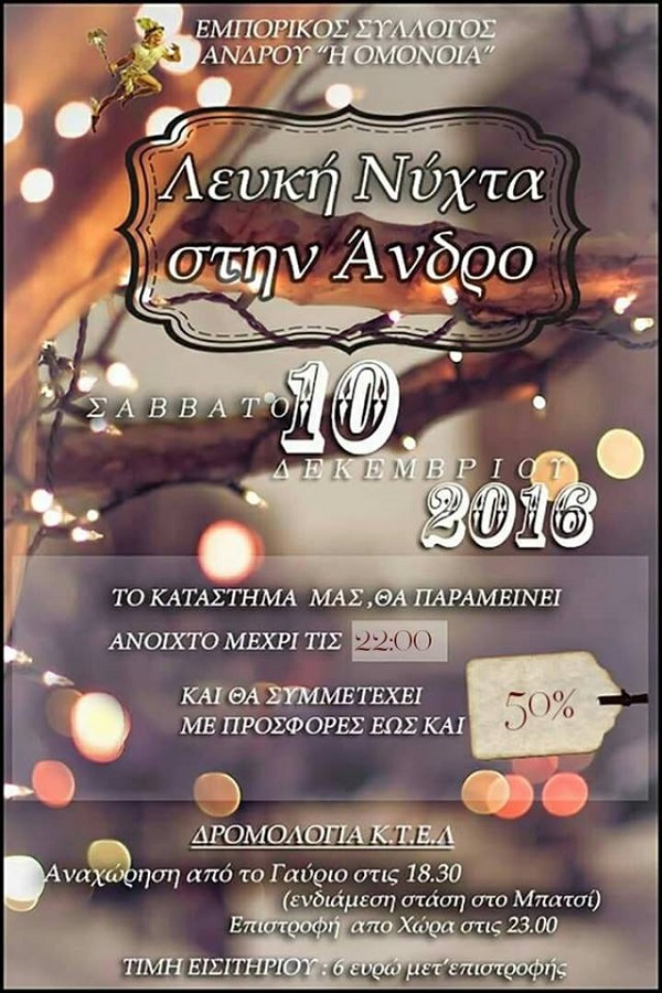 Χτες το απόβραδο ευγενική καταστηματάρχης της Χώρας έστειλε την αφίσα του Εμπορικού Συλλόγου Άνδρου όπου αναγγέλλεται η «Λευκή Νύχτα» για τις 10 Δεκεμβρίου ημέρα Σάββατο. Καμία άλλη ειδοποίηση ή κάποιο πρόγραμμα για την συγκεκριμένη βραδιά. Στην αφίσα αναγράφεται πως τα καταστήματα (όλα ή κάποια δεν διευκρινίζεται) θα παραμείνουν ανοικτά μέχρι τις 22:00 και ότι… Continue reading Λευκή «σιωπηλή» νύχτα στις 10/12 στη Χώρα – Μεγάλη προετοιμασία στο Κόρθι