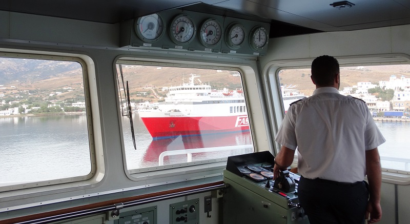 Λιμάνι Γαυρίου: ο καπετάν Θανάσης Χαλάς της Golden Star κάνει μανούβρα μπαίνοντας στο λιμάνι του Γαυρίου, όπου ετοιμάζεται για αναχώρηση πλοίο της Fast Ferries.