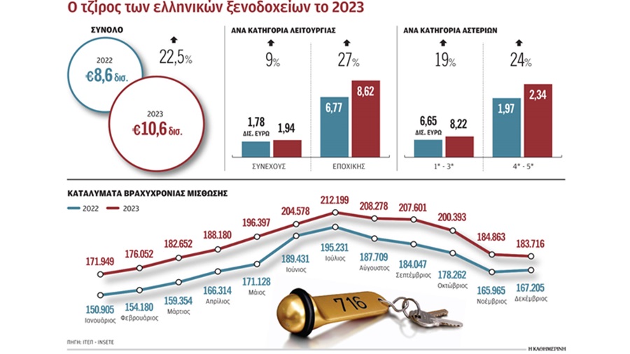 Το 2022 ο τζίρος των ξενοδοχείων ήταν 8,6 δισεκατομμύρια ευρώ. Το 2023 ήταν 10,6 δισ. ευρώ. Μια αύξηση 22,5%. Από την άλλη το 2022 τα καταλύματα arbnb ήταν 167.205, ενώ το 2023 έφτασαν τα 183.716 και οι διαθέσιμες κλίνες στα μεν arabnb ανήλθαν σε 939.000, ενώ στα ξενοδοχεία σε 887.748…