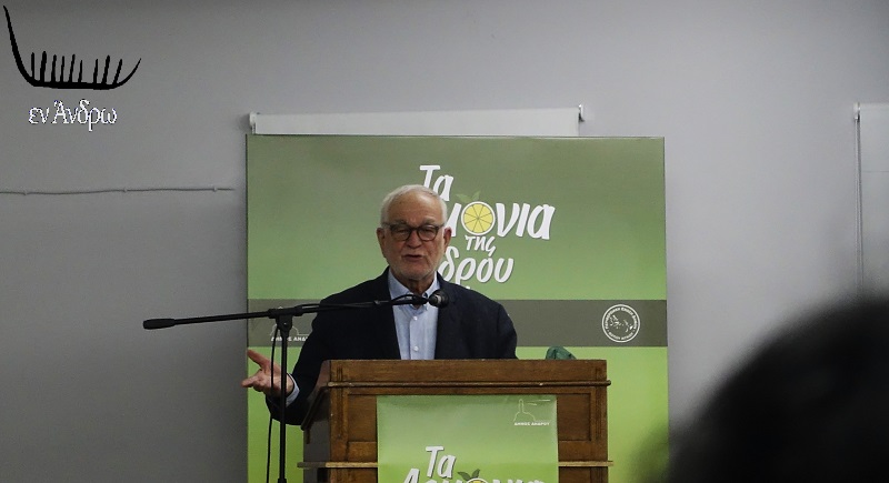 H υπηρεσία δόμησης του δήμου Άνδρου προχώρησε σε προέγκριση οικοδομικής άδειας του Ν. Κουτσιανά για την ανέγερση ξενοδοχείου 5 αστέρων στη θέση Άμμος-Κρινάκια στον οικισμό Όρμου Κορθίου. Στη φωτογραφία ο Νίκος Κουτσιανάς μιλά για τα λεμόνια της Άνδρου σε ημερίδα του Δήμου Άνδρου το 2022.