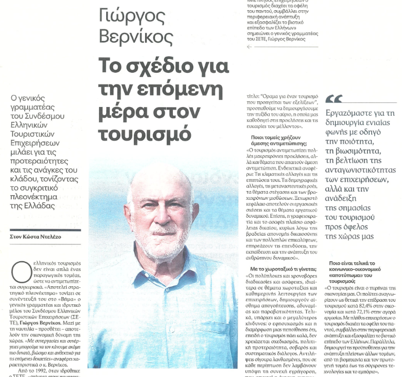 ΣΥΝΕΝΤΕΥΞΗ ΣΤΟ ΒΗΜΑ Ο ελληνικός τουρισμός δεν είναι απλά ένας παραγωγικός τομέας, ώστε να αντιμετωπίζεται συγκυριακά. «Αποτελεί στρατηγικό πλεονέκτημα», τονίζει σε συνέντευξή του στο ΒΗΜΑ ο γενικός γραμματέας και ιδρυτικό μέλος του Συνδέσμου Ελληνικών Τουριστικών Επιχειρήσεων (ΣΕΤΕ), Γιώργος Βερνίκος. Μαζί με τη ναυτιλία -προσθέτει- αποτελούν την οικονομική δύναμη της χώρας. «Με συνεργασίες και συνέργειες μπορούμε… Continue reading ΓΙΩΡΓΟΣ ΒΕΡΝΙΚΟΣ: Το σχέδιο για την επόμενη μέρα στον τουρισμό