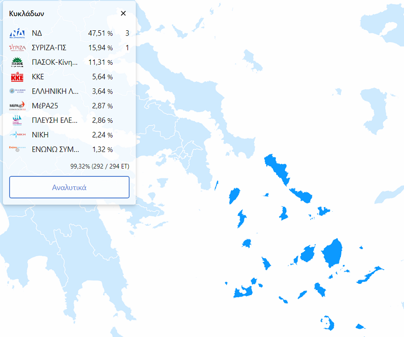 Χάρτης αποτελεσμάτων Κυκλάδων 21ης Μαΐου 2023 Βαδίζουμε προς τις εκλογές της 25ης Ιουνίου 2023. Η προεκλογική κίνηση στην Άνδρο είναι πεσμένη. Οι υποψήφιοι ακόμα και όταν έρχονται περνάνε απαρατήρητοι σχεδόν. Το αποτέλεσμα στο νησί (όπως και σε όλη την Ελλάδα) έχει προεξοφληθεί. Η ΝΔ με τελικό αποτέλεσμα σχεδόν 54% στις εκλογές του Μαΐου και ο… Continue reading ΑΝΔΡΟΣ: Η πολιτική και τουριστική κίνηση ενόψει των εκλογών της 25ης Ιουνίου