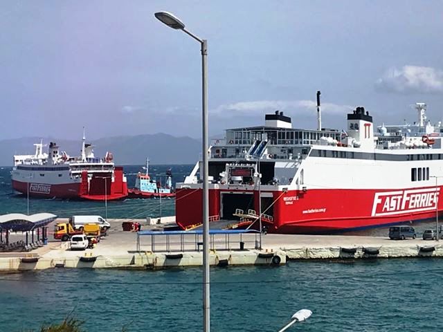 Το Αικατερίνη στην Ραφήνα χθες υποβοηθούμενο από ρυμουλκό (φωτ. Αθανασία Δρίβα). Το «Αικατερίνη» μετά την μηχανική βλάβη την οποία υπέστη χτες το πρωί έξω από την Άνδρο επέστρεψε στην Ραφήνα και αποβίβασε επιβάτες, ΙΧ και νταλίκες, οι οποίοι προωθήθηκαν στους προορισμούς τους με το απογευματινό πλοίο της Faste Ferries «Θεολόγος».
