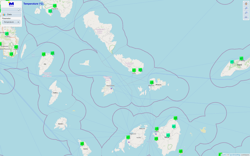 Οι μετεωρολογικοί σταθμοί των Κυκλάδων όπως αποτυπώνονται στον χάρτη της μετεωρολογικής υπηρεσίας.