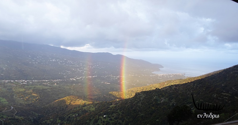 Γύρω στις 17:00 της Παρασκευής 13 Ιανουαρίου 2023 η μεγάλη βροχή ολοκλήρωσε τον 12ωρο κύκλο της στην Άνδρο κι ένα διπλό ουράνιο τόξο άπλωσε πάνω από την κοιλάδα της Χώρας σημαίνοντας την λήξη της καταιγίδας.
