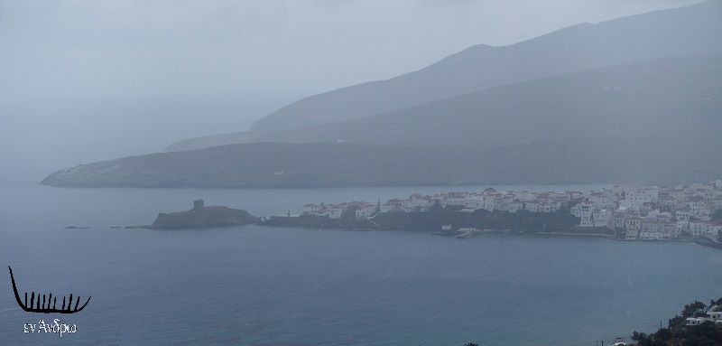Ξαφνικά μαύρα σύννεφα άρχισαν να μαζεύονται γύρω στις 1:00 το μεσημέρι πάνω από την Χώρα. Γύρω στις 1:20 άρχισε να ρίχνει σταγόνες μεγάλες σαν πέτρες! Και ξεκίνησε η μπόρα. Η καταιγίδα “Genesis” έφτασε και στην ανατολική πλευρά της Άνδρου. Μέσα σε λίγα λεπτά έριχνε μια ξαφνική νεροποντή. Μια μεγάλη κουρτίνα νερού σκέπασε την Χώρα…