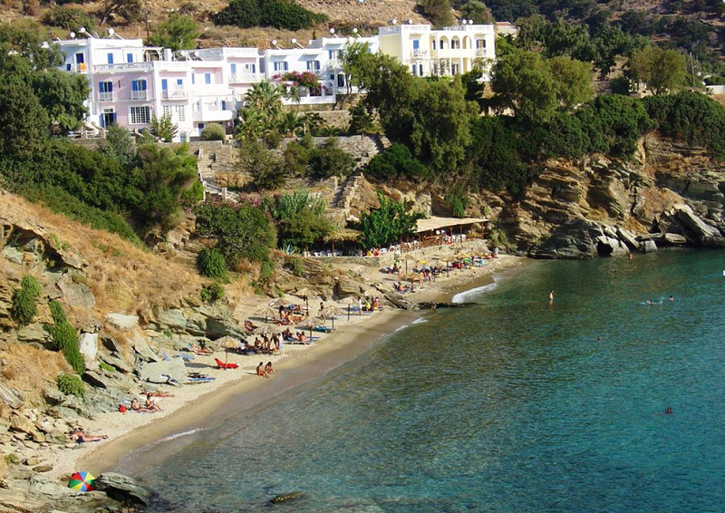 Η παραλία Δελαβόγια στην Άνδρο. Από πάνω της το ξενοδοχείο Αναιρούσα.