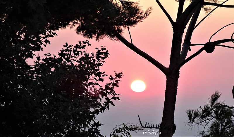 Ο ήλιος χάθηκε σχεδόν πίσω από τα αποκαΐδια των Βιλίων που άπλωναν στον ουρανό και σκέπαζαν τη δύση της Άνδρου. Το τεράστιο γκρίζο σύννεφο του καπνού με τις κοκκινοκίτρινες ανταύγειες του ήλιου στα άκρα, που ήταν σα να αποτύπωναν την φωτιά στον ουρανό, άπλωσε από τη μια μέχρι την άλλη άκρη στον ορίζοντα.