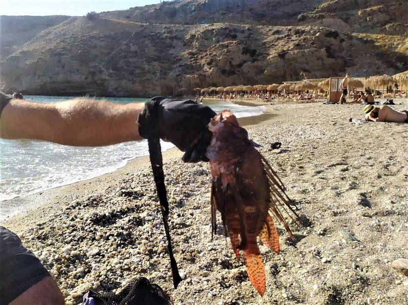 Του Στέλιου Φανουράκη Γεωπόνος-Ιχθυολόγος Λιονταρόψαρο στην όμορφη παραλία των Αποθηκών! Πρόκειται για ψάρι που περνά στη Μεσόγειο από το Σουέζ. Μαζί με άλλα αντίστοιχα ψάρια όπως η αγριόσαλπα ή Γερμανός, ο μονόχειρας κλπ, έχουν αρχίσει να αποτελούν την καθημερινότητα στους βυθούς της Άνδρου.