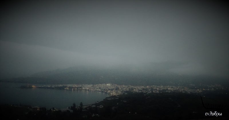 Εξωπραγματικός καιρός. Εξωπραγματικές εικόνες. Απόβραδο Κυριακής 18 Απριλίου και η Άνδρος έχει χαθεί μέσα σε μια ομίχλη που απλώνει στα βουνά και στην αφρικάνικη σκόνη που απλώνει παντού. Τοπίο θολό, υγρό, παράξενο. Πνιγηρό. Δεν υπάρχει ορίζοντας. Θαμπά τα περιγράμματα. Η Άνδρος όπως δεν την ξέραμε. Κι όπως σπάνια θα την ξαναδούμε υπό αυτές τις συνθήκες…