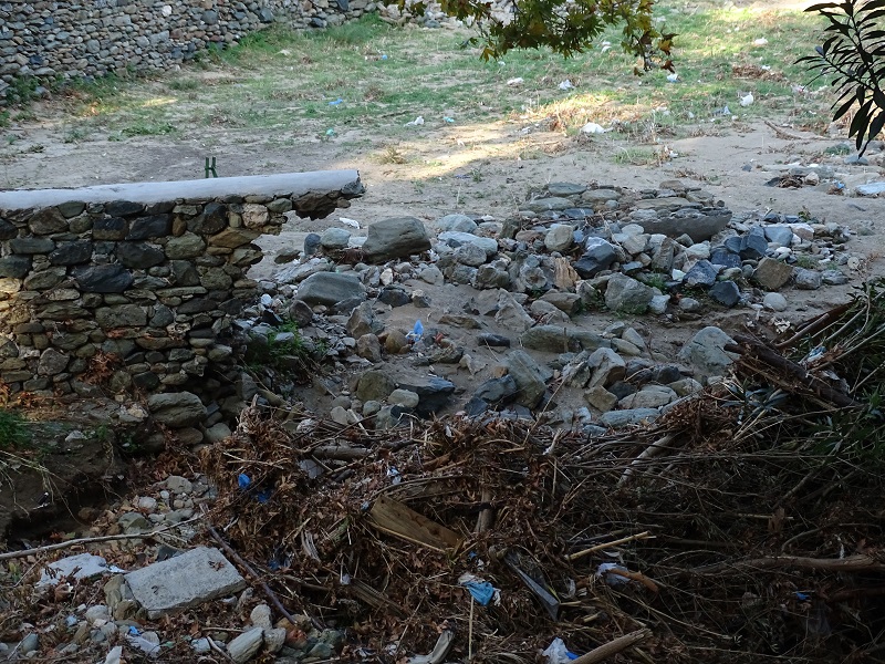 Εδώ υπήρχε μια πέτρινη μάντρα δίπλα στο ρέμα Στενιών για να προστατεύει το χωράφι από το ρέμα. Όπως φαίνεται την πήρε το ποτάμι. Οι παλιοί έχτιζαν διαφορετικά πλάι στα ρέματα (όρθια οι πέτρες). Εδώ χτίστηκε διαφορετικά ο μαντρότοιχος και το φουσκωμένο ρέμα πήρε τον τοίχο κι έφυγε!