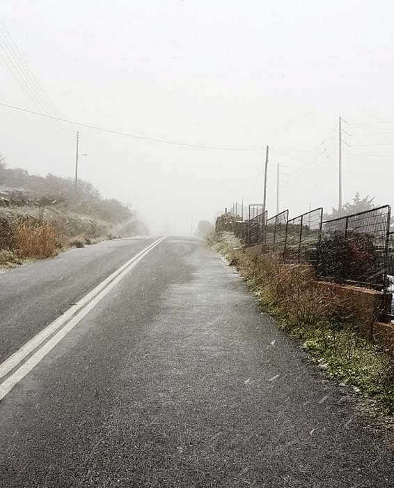 Ο δρόμος στην περιοχή του Απροβάτου σήμερα, ενώ έχει ξεκινήσει η χιονόπτωση (φωτ. Εν Άνδρω). Με απόφαση του Δημάρχου Άνδρου κ. Θεοδόση Σουσούδη, κλειστά θα παραμείνουν αύριο, Τρίτη, 8 Ιανουαρίου 2019, τα σχολεία και οι παιδικοί σταθμοί του Δήμου Άνδρου.