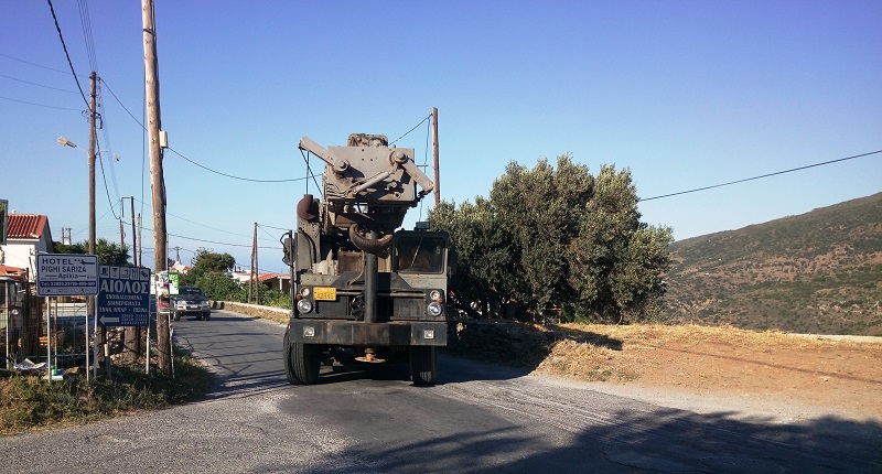Το γεωτρύπανο το απόγευμα 21/6 στη στροφή των Μενήτων. Έρχεται από Κοχύλου με κατεύθυνση Εβρουσιές (φωτ. Εν Άνδρω). Ήρθε το μεγάλο γεωτρύπανο στην Άνδρο κι άρχισε γεωτρήσεις. Πρώτη τρυπανιά προχτές στο Κοχύλου. Βρήκε καλό νερό σε ποσότητα στα 53 μέτρα. Αναμένονται οι αντλίες και οι συνδέσεις με την τοπική δεξαμενη.