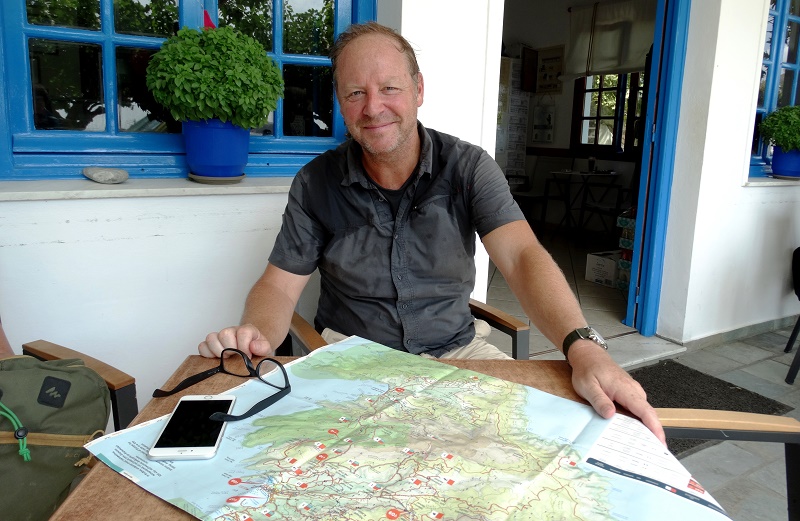 Ο Gert – Jean σχεδιάζει τις διαδρομές του στα μονοπάτια της Άνδρου πίνοντας τον πρωινό καφέ του στου Στυλιανού στον Νειμποριό (φωτ. Εν Άνδρω). Ο Gert–Jean ήρθε από την Ολλανδία, το Άμστερνταμ, για λίγες μέρες στην Άνδρο. Στόχος να περπατήσει στα μονοπάτια της Άνδρου. Διάβασε σε ένα ολλανδικό ηλεκτρονικό περιοδικό ένα παλαιότερο αφιέρωμα για την Άνδρο.… Continue reading Καλοκαίρι στα μονοπάτια της Άνδρου…