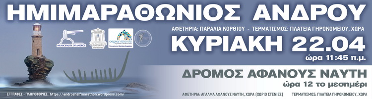 ΔΕΛΤΙΟ ΤΥΠΟΥ: Ξεκίνησαν οι προετοιμασίες για τη διεξαγωγή του 2ου Ημιμαραθωνίου Άνδρου Με οδηγό την περσινή επιτυχημένη διοργάνωση, ο Δήμος Άνδρου, με συνδιοργανώτρια την Περιφέρεια Νοτίου Αιγαίου και την υποστήριξη του αθλητικού συλλόγου Α.Π.Σ. Τελμησσός Νέας Μάκρης – Μαραθώνα, διοργανώνει τον 2ο Ημιμαραθώνιο Άνδρου. Η πρώτη συνάντηση των διοργανωτών με τους συλλόγους, τους φορείς… Continue reading O 2ος Ημιμαραθώνιος της Άνδρου