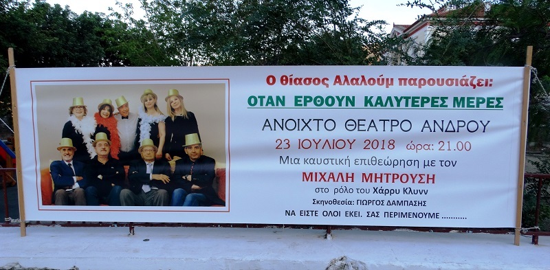 Ξεκινά η καλοκαιρινή σαιζόν τη Δευτέρα 23 Ιουλίου στο Ανοιχτό θέατρο της Χώρας στην Άνδρο με μια καυστική επιθεώρηση του Γιώργου Δάμπαση με τραγούδια και σατυρικά σκετς της δεκαετίας του ’80. Η παράσταση είναι αφιερωμένη στη μνήμη του Χάρρυ Κλυνν. Γράφει για την παράσταση ο Γιώργος Δάμπασης: «Στη νεότερη ιστορία μας η δεκαετία του… Continue reading Ανοιχτό Θέατρο, Δευτέρα 23/7: “Όταν θα έρθουν καλύτερες μέρες!”