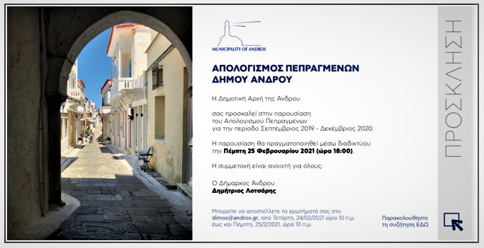ΔΕΛΤΙΟ ΤΥΠΟΥ Στον απολογισμό του Δημοτικού Έργου για τους πρώτους 16 μήνες της θητείας του προχωράει ο Δήμαρχος Άνδρου Δημήτρης Λοτσάρης σε ειδική διαδικτυακή συνεδρίαση την Πέμπτη 25 Φεβρουαρίου 2021 και ώρα 18:00. Θα γίνει παρουσίαση ανά τομέα έργων, προμηθειών, θεσμικών παρεμβάσεων, που έγιναν, καθώς και παρουσίαση όσων έχουν ήδη προγραμματιστεί.