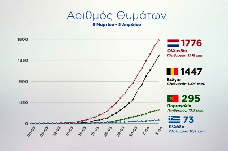 Εντυπωσιακή η καμπύλη των θυμάτων στην Ελλάδα. Σχεδόν εφάπτεται στον άξονα. Σε αντίθεση με τις άλλες τρεις χώρες που έχουν τα ίδια πληθυσμιακά χαρακτηριστικά όπου απογειώνεται. Ιδίως στην περίπτωση του Βελγίου και της Ολλανδίας.