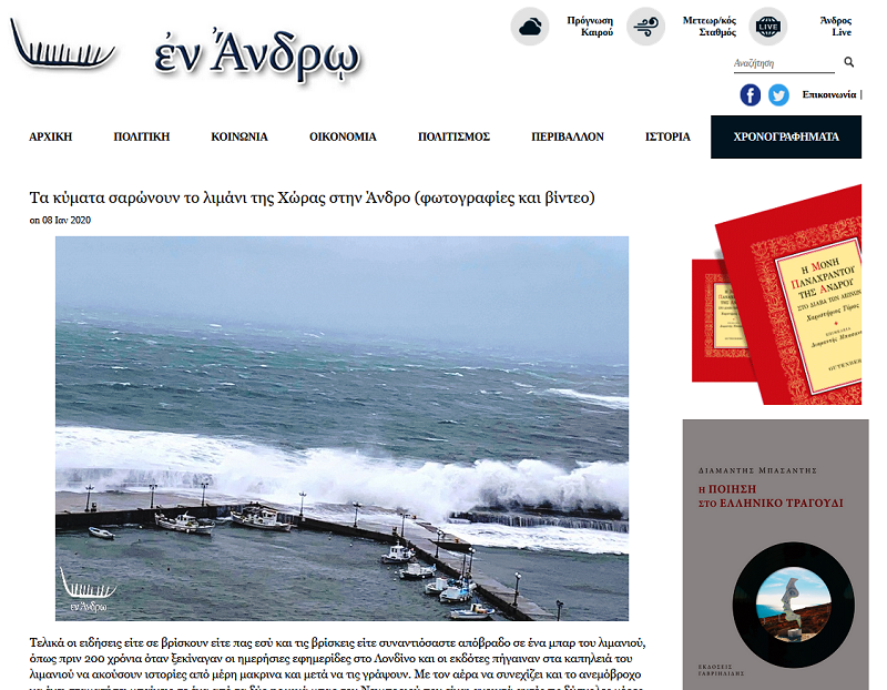 Τις μέρες της καταιγίδας πολλές χιλιάδες ήταν οι επισκέπτες του Εν Άνδρω σε καθημερινή βάση. Το ξεκίνημα: Ήταν Οκτώβριος του 2013 όταν άρχισε να σχεδιάζεται το Εν Άνδρω. Είμαστε 2-3 φίλοι. Οι δύο στον τεχνικό τομέα, κι εγώ στον ρόλο του διαχειριστή. Θυμάμαι τον ένα εκ των δύο να λέει: “είναι εντυπωσιακό, έχουμε αναρτήσει μόνο… Continue reading “ΕΝ ΑΝΔΡΩ”: 1.285.000 επισκέψεις και 291.000 χρήστες το 2019! Αποτίμηση μιας διαδρομής…