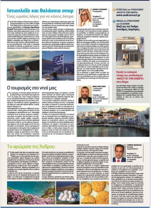 Έφτασε στο ηλεκτρονικό ταχυδρομείο το 4ο τεύχος της εφημεριδούλας ΜΑΖΙ ΓΙΑ ΤΗΝ ΑΝΔΡΟ. Στα θετικά ότι μέσα από τις σελίδες του αρχίζουν οι υποψήφιοι σύμβουλοι του συνδυασμού να παρουσιάζουν τις πρώτες σκέψεις τους. Δεν είναι πλέον ονόματα και βουβά πρόσωπα. Δεν είναι φωτογραφίες και βιογραφικά. Αλλά είναι και κατάθεση ιδεών, σκέψεων. προτάσεων. Αρχίζουμε να… Continue reading 4ο τεύχος: Ευστοχίες, αλλά και αστοχίες…