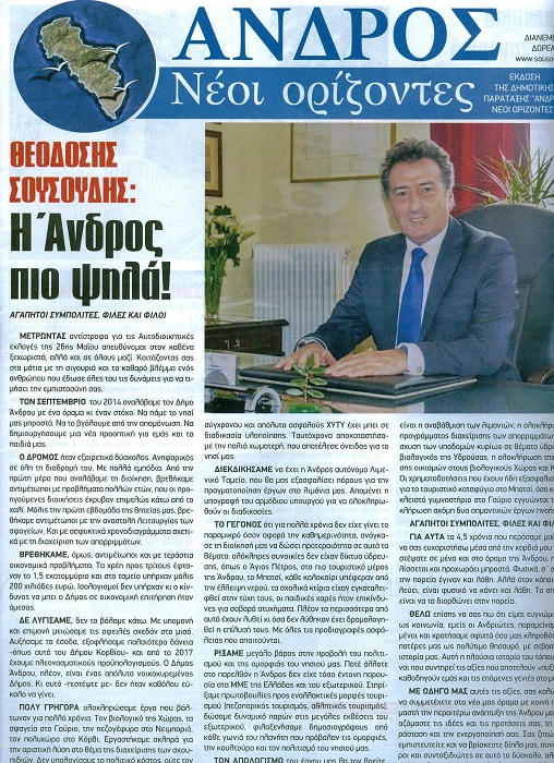 Οι σελίδες 1 & 2 του φυλλαδίου Μαζί Νο 3 του συνδυασμού “ΜΑΖΙ ΓΙΑ ΤΗΝ ΑΝΔΡΟ του Δ. Λοτσάρη. Θέματα: Ανακύκλωση, προώθηση αγροτικών προϊόντων της Άνδρου, υγεία. Από την ομάδα του κ. Λοτσάρη λάβαμε και δημοσιεύουμε το τεύχος Μαζί Νο 3 στο οποίο παρουσιάζει τις θέσεις του αυτή την φορά στο μέγα ζήτημα της ανακύκλωσης.… Continue reading ΜΑΖΙ Νο 3: Τρεις προτάσεις (ανακύκλωση, αγροτικά προϊόντα, Ναυτική Ακαδημία), προσωπικοί χαρακτηρισμοί και υπονοούμενα, νέοι υποψήφιοι…