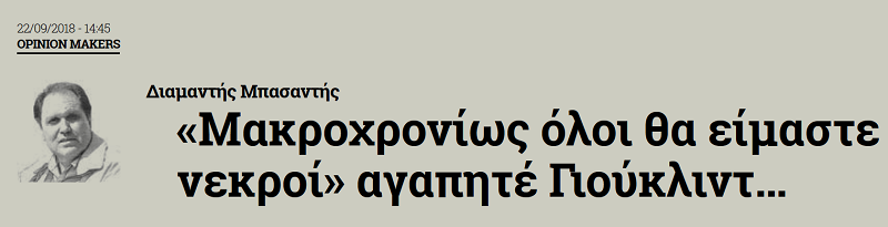 ΑΝΑΔΗΜΟΣΙΕΥΣΗ – PRONEWS.GR Από έναν απόφοιτο του Λυκείου Αμπελοκήπων που πήρε πτυχίο πολιτικού μηχανικού δεν έχουμε την απαίτηση να ξέρει τον Τζων Μέυναρντ Κέυνς, πρώτο βαρώνο Κέυνς του Τίλτον (John Maynard Keynes, 5 Ιουνίου 1883 – 21 Απριλίου 1946). Τον σπουδαίο Άγγλο οικονομολόγο, μαθηματικό, καθηγητή πανεπιστημίου και συγγραφέα που υπήρξε ο εισηγητής του Κευνσιανισμού. Ούτε… Continue reading «Μακροχρονίως όλοι θα είμαστε νεκροί» αγαπητέ Γιούκλιντ…