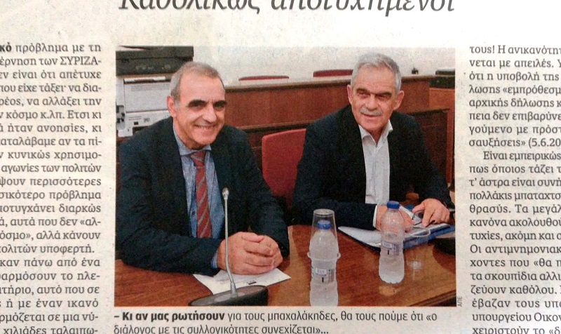 “Καθολικώς αποτυχημένοι” τιτλοφορεί άρθρο του ο Πάσχος Μανδραβέλης στην ΚΑΘΗΜΕΡΙΝΗ της ΚΥΡΙΑΚΗΣ (10 Ιουνίου 2018). κι από κάτω δημοσιεύει μια χαμογελαστή φωτογραφία δυο στενών συνεργατών της σημερινής κυβέρνησης: του υπουργού Προστασίας του Πολίτη Ν. Τόσκα και του ΓΓ Πολιτικής Προστασίας Γ. Καπάκη. Στη χιουμοριστική λεζάντα απαντά ο ένας συνεργάτης στον άλλο: “Κι αν μας ρωτήσουν για τους… Continue reading “Καθολικώς αποτυχημένοι”…