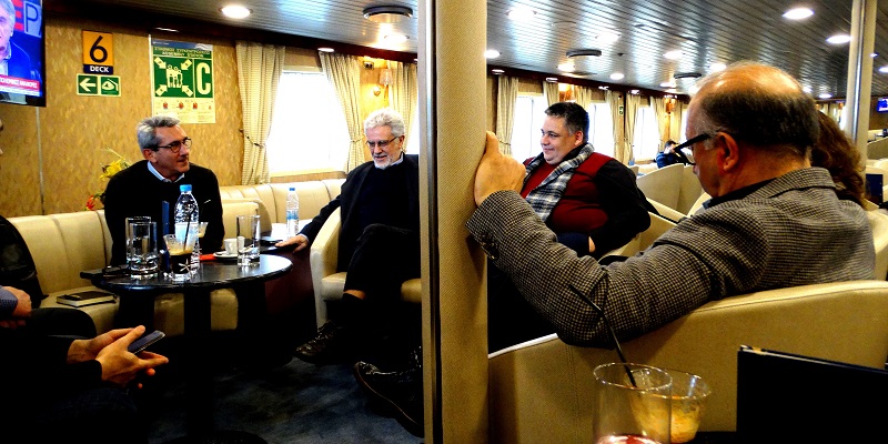 Οι παρεβρισκόμενοι στην πρωινή “καραβίσια” συσκεψη (φωτ. Εν Άνδρω). ΄Σύσκεψη εν πλω!!! Το πλοίο εκτελούσε το πρωνό δρομολόγιο για την Άνδρο. Στο σαλόνι της πρώτη υέσης γύρω από ένα τραπέζι με καφέδες και νερά τρεις πολιτικοί παράγοντες της Περιφέρειας Νοτίου Αιγαίου και ένα καθηγητής. Από αριστερά προς δεξιά: ο περιφερειάρχης Γιώργος Χατζηνάρκος, ο καθηγητής Βαγγέλης… Continue reading Σύσκεψη – για τρεις υδατοδεξαμενές στην Άνδρο – … εν πλω!!!