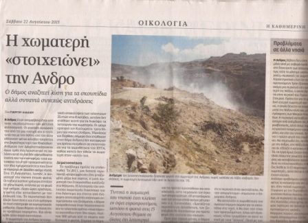 Του Γιώργου Λιάλιου Εκτενές δημοσιεύμα της Καθημερινής για την χωματερή της Άνδρου με αναφορά στο “εν Άνδρω” και σε άρθρο του Διαμαντή Μπασαντή Η Aνδρος ήταν αναμφίβολα ένας από τους «κερδισμένους» του φετινού καλοκαιριού. Οι φυσικές ομορφιές της από τη μια πλευρά και η εγγύτητά της με την Αθήνα από την άλλη οδήγησαν φέτος χιλιάδες… Continue reading Το “εν Άνδρω” στην ΚΑΘΗΜΕΡΙΝΗ: “Η χωματερή «στοιχειώνει» την Άνδρο”