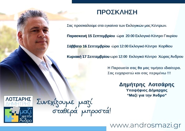 ΓΑΥΡΙΟ Να ξεκινήσουμε το ρεπορτάζ των εγκαινίων των εκλογικών κέντρων του δημάρχου Δημήτρη Λοτσάρη με μια παραδοχή που κάναμε κι εμείς έκανε όμως κι ο παπάς στο Κόρθι: με τα εγκαίνια των εκλογικών κέντρων ξεκινά και επίσημα ο προεκλογικός αγώνας. Με δεδομένο πως χτες Παρασκευή 15/9 και σήμερα Σάββατο 16/9 έγιναν τα εγκαίνια της παράταξης… Continue reading ΕΓΚΑΙΝΙΑ ΕΚΛΟΓΙΚΩΝ ΚΕΝΤΡΩΝ ΛΟΤΣΑΡΗ: Γαύριο & Κόρθι. Και πολιτικός σχολιασμός…