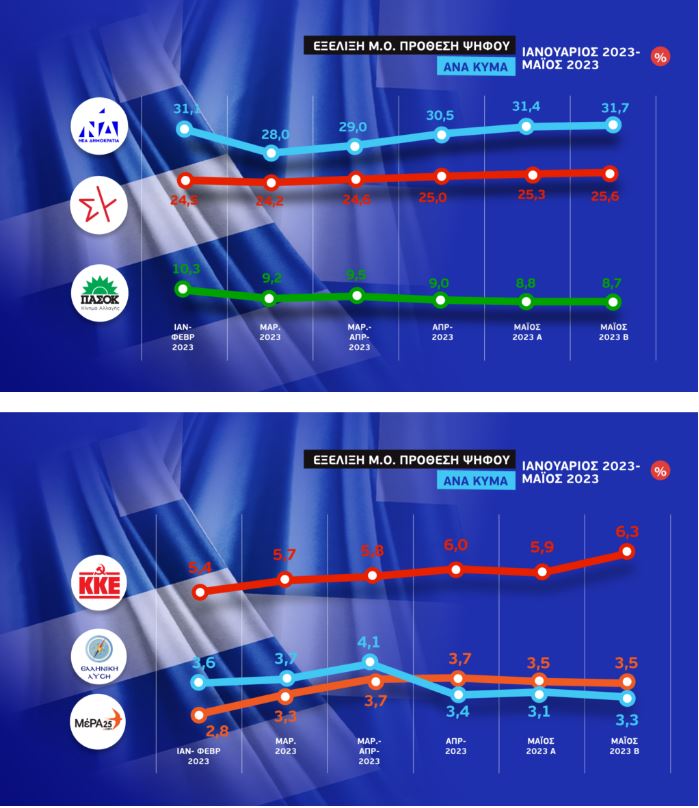 Η διαχρονική εξέλιξη της πρόθεσης ψήφου από τον Ιανουάριο του 2023 έως σήμερα Προβάδισμα 6,1 ποσοστιαίων μονάδων διατηρεί η Νέα Δημοκρατία έναντι του ΣΥΡΙΖΑ σύμφωνα με την εκλογική έρευνα που παρουσίασε η ΕΡΤ, το βράδυ της Παρασκευής. Η έρευνα πραγματοποιήθηκε με βάση τις τελευταίες δημοσκοπήσεις οκτώ εταιρειών και αποτελεί την τελευταία καταγραφή πριν το άνοιγμα της κάλπης την Κυριακή.