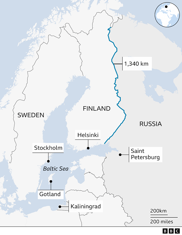 Ένταξη της Φιλανδίας στο ΝΑΤΟ – όπως δείχνει ο χάρτης του BBC – δημιουργεί σύνορα 800 χιλιομέτρων επαφής Ρωσίας και ΝΑΤΟ. Και το κυριώτερο – όπως αναφέρεται σε όλες τις αναλύσεις φέρνει την Αγία Πετρούπολη μόλις 90 χιλιόμετρα από τους ΝΑΤΟϊκούς στρατιωτικούς σχηματισμούς.