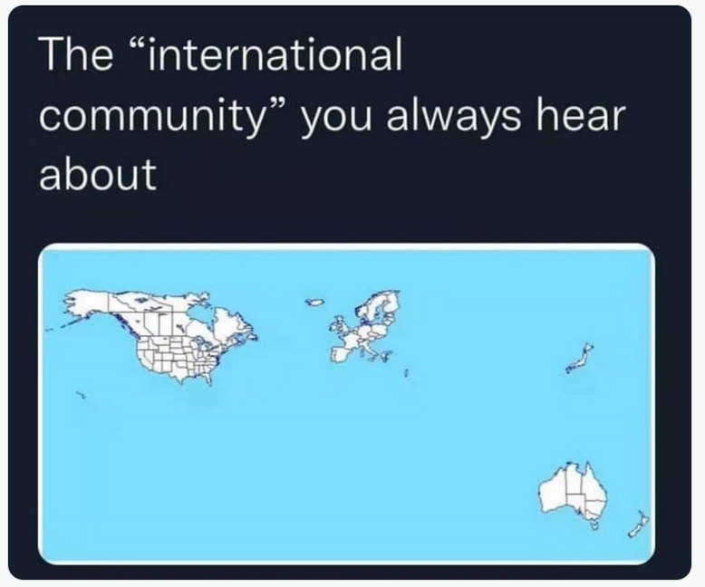 Της Μαρίας Δεδούση CNN Greece (Η παραπάνω φωτογραφία από κινέζικο σάιτ αναπαριστα την “διεθνή κοινότητα” όπως την “βλέπει” ο δυτικός κόσμος. Απουσιάζει από την δυτική οπτική όπως βλέπουμε το μεγαλύτερο μέρος της γης!!! Και το κυριώτερο: απουσιάζουν τα μεγαλύτερα εθνικά κράτης της γης: η Κίνα και η Ινδία. Κι αν για την Κίνα ξέρουμε… Continue reading Ινδία: Ο άγνωστος «x» στη διεθνή σκακιέρα και η στάση της για την Ουκρανία