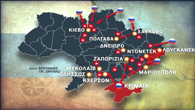 Ο χάρτης του πολέμου του βρετανικού υπουργείου Άμυνας δείχνει την Ουκρανία περικυκλωμένη από το ρωσικό στρατό.