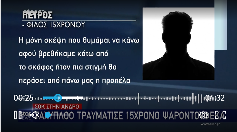 ΑΝΑΔΗΜΟΣΙΕΥΣΗ: Star Channel «Άρχισα να φωνάζω με όλη μου τη δυνάμη», λέει στο Star Από θαύμα ζει ένας νεαρός 15 χρόνων, ο οποίος τραυματίστηκε από ταχύπλοο την ώρα που έκανε ψαροντούφεκο σε παραλία της Άνδρου. Ο χειριστής του σκάφους συνελήφθη και μετά από αλκοτέστ που του έγινε διαπιστώθηκε ότι οδηγούσε μεθυσμένος. Ο φίλος του τραυματία… Continue reading Άνδρος: Συγκλονίζει ο φίλος του 15χρονου Θοδωρή – Πώς κατάφερε να τον σώσει