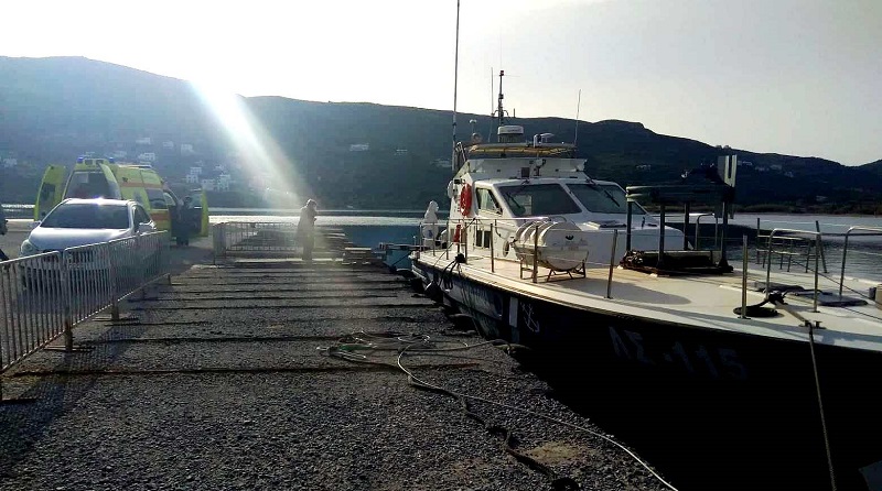 Φωτογραφία στην προβλήτα του Γαυρίου από την μεταφορά του ασθενούς από το ασθενοφόρο του ΕΚΑΒ στο σκάφος του λιμενικού σώματος. Όλοι του πληρώματος με τις ειδικές αντι-covid στολές.