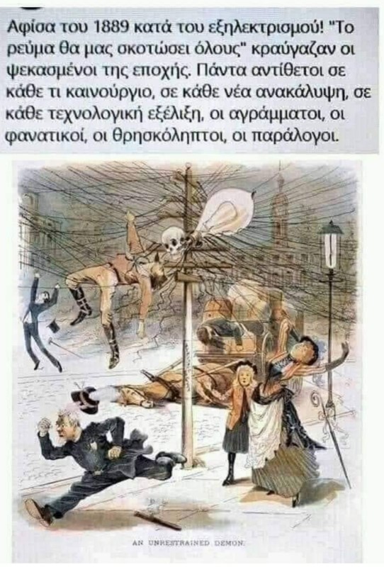 Ο αναγνώστης μας Θανάσης Κυρτάτας μας έστειλε μια απίστευτη αφίσα του 1889 που εκδόθηκε από τους τότε “ψεκασμένους” και στρεφόταν κατά του… ηλεκτρισμού!!! Απίστευτο κι όμως αληθινό Υπήρχαν τότε ομάδες ανθρώπων που ήταν κατά του ηλεκτρισμού γιατί “το ρεύμα θα τους σκότωνε όλους”!!!